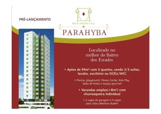 O documento descreve as instalações e características de um condomínio residencial localizado na Av. Minas Gerais com Rua Paraíba a 100m do Dede. O condomínio conta com recepção, hall de entrada, piscina, playground, playkids, salão de festas, academia, sala com varanda inédita de mais de 8 metros com churrasqueira individual.