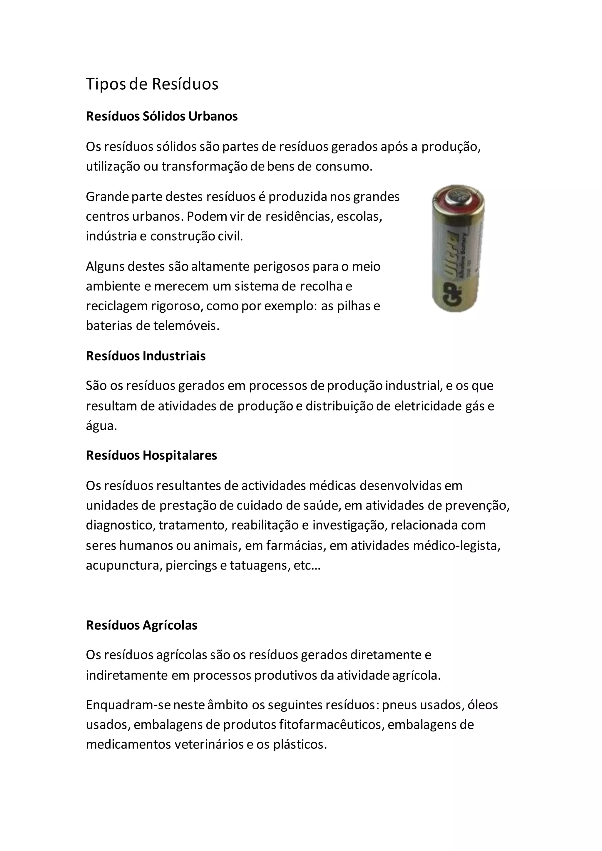 O documento descreve os principais tipos de resíduos: resíduos sólidos urbanos produzidos em centros urbanos, resíduos industriais gerados por processos industriais, resíduos hospitalares de atividades médicas, e resíduos agrícolas da produção agrícola. Além disso, apresenta os 5Rs para redução e reciclagem de resíduos: reciclar, reduzir, reutilizar, responsabilizar e respeitar.