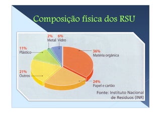 O documento discute diferentes tipos de resíduos classificados por suas características e origem, incluindo resíduos perigosos e não perigosos, resíduos industriais, hospitalares, agrícolas e urbanos. Ele também descreve locais como lixeiras, aterros sanitários e estações de tratamento de resíduos, além de métodos como incineração, compostagem e tratamento de águas residuais.