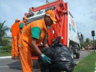 O documento discute os resíduos sólidos, incluindo sua coleta, formas de tratamento e destinação final. A coleta pode ser seletiva, de resíduos públicos ou domiciliares. Os tratamentos incluem compostagem, aterros controlados e incineração. A destinação final mais adequada é o aterro sanitário, onde o lixo é aterrado e coberto de forma a proteger o meio ambiente.