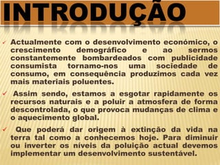 introduçãoActualmente com odesenvolvimento económico, o crescimento demográfico e ao sermos constantemente bombardeados com publicidade consumista tornamo-nos uma sociedade de consumo, em consequência produzimos cada vez mais materiais poluentes.