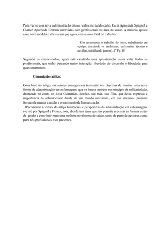 O documento resume um artigo sobre um estudo realizado na Santa Casa de Belo Horizonte sobre as tendências e perspectivas da administração em enfermagem. O artigo descreve um novo modelo de gestão implementado que reduziu a hierarquia e promoveu o trabalho em equipe e a comunicação entre os funcionários. Entrevistas com profissionais indicaram que o novo modelo tornou o trabalho mais fácil e promoveu maior interação e liberdade para questionamentos.