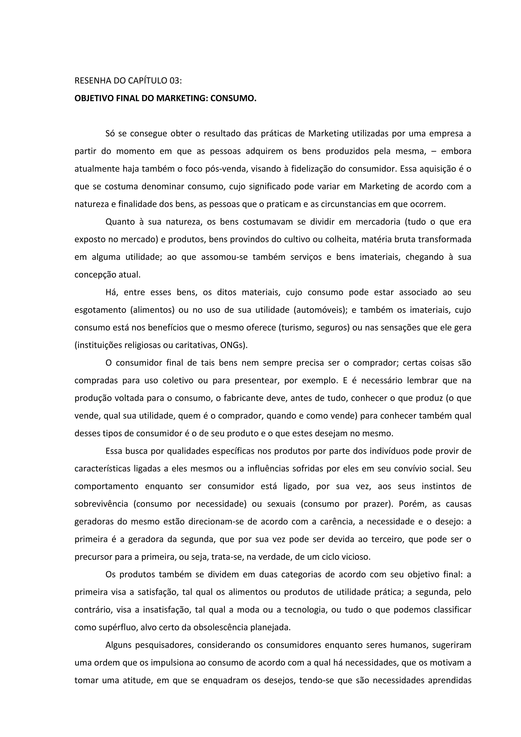 O documento discute o objetivo final do marketing, que é o consumo. Explica que o consumo pode variar de acordo com a natureza do produto, quem o consome e as circunstâncias. Também discute as necessidades dos consumidores que levam ao consumo, desde necessidades fisiológicas até psicológicas, e como as empresas também tem necessidades que guiam suas ações de marketing.