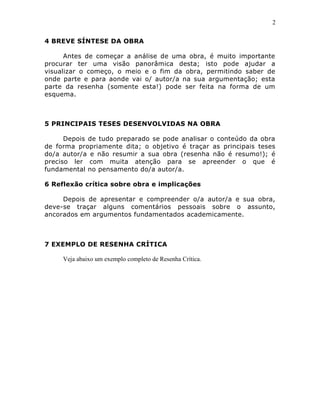 O documento descreve os elementos essenciais de uma resenha crítica, incluindo a referência bibliográfica da obra, apresentação do autor, perspectiva teórica, breve síntese, principais teses e reflexão crítica. Fornece também um exemplo completo de resenha crítica de um livro sobre o método científico nas ciências naturais e sociais.