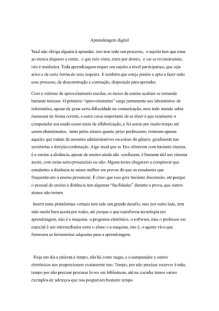 A aprendizagem requer disposição e envolvimento do aluno no processo de desconstrução e reconstrução do conhecimento. Embora os computadores tenham sido introduzidos nas escolas, raramente eram usados para alfabetização e acabaram sendo abandonados. Atualmente, o ensino a distância, embora ainda cause desconfiança, tem se mostrado útil, com alguns estudos indicando que alunos a distância podem ter melhor desempenho em provas.