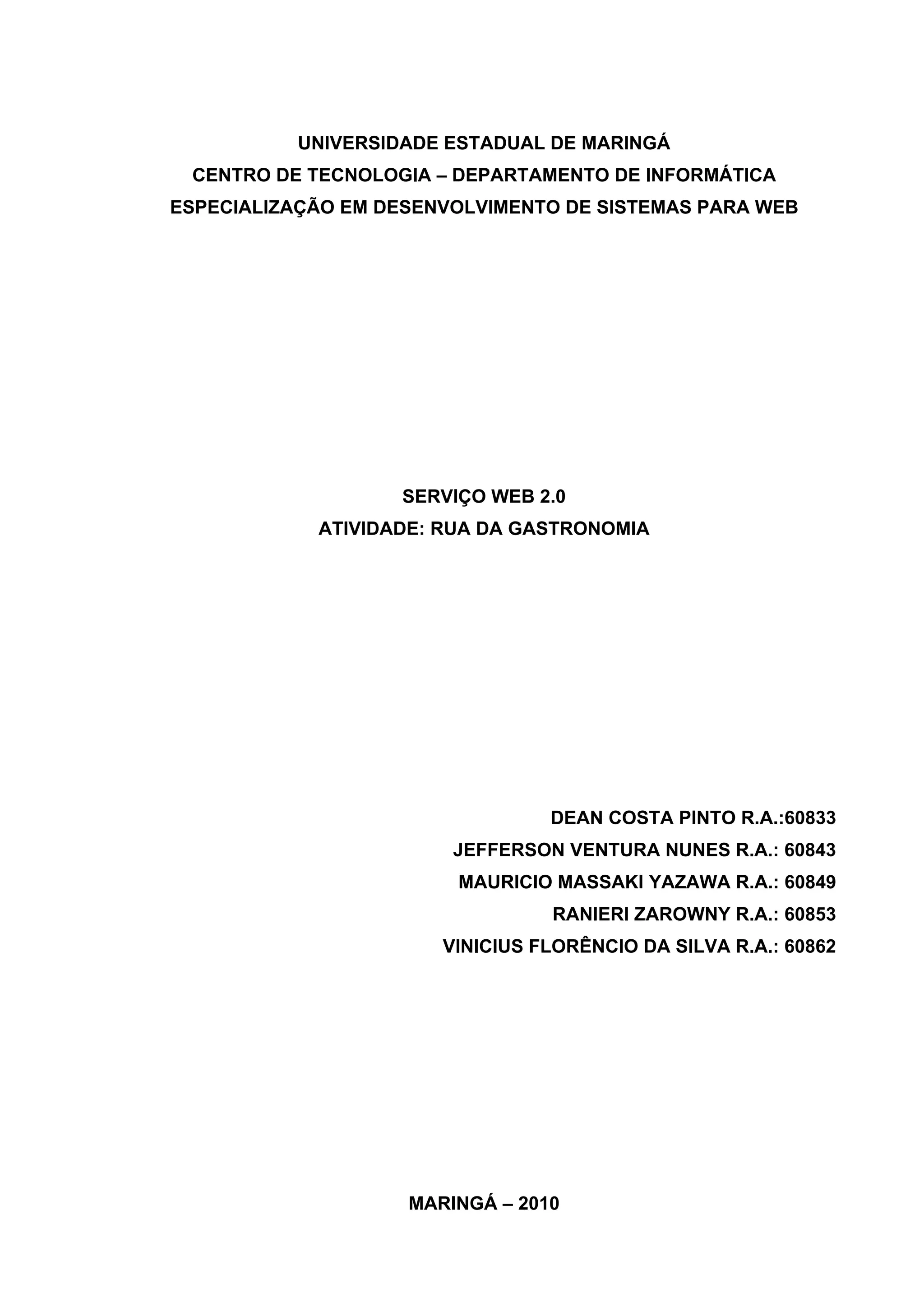 Este documento descreve o projeto de um serviço web chamado "Rua da Gastronomia" desenvolvido por alunos da Universidade Estadual de Maringá. O serviço permite que usuários encontrem restaurantes em seu local e vejam detalhes como cardápios, fotos, vídeos e avaliações. Os alunos conduziram entrevistas, mapeamento mental, card sorting e wireframes para projetar e testar o site antes do desenvolvimento.
