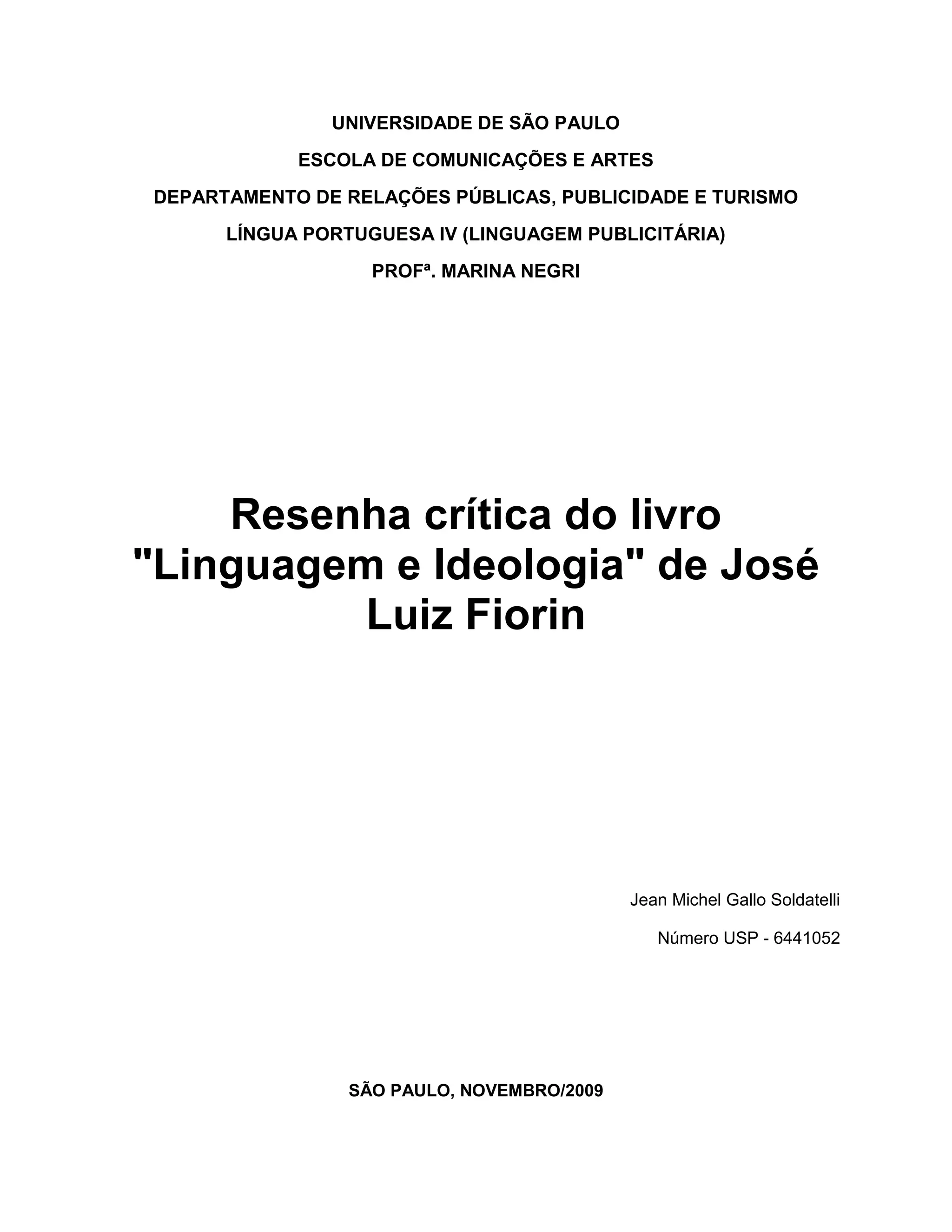 O documento apresenta uma resenha crítica do livro "Linguagem e Ideologia" de José Luiz Fiorin. A resenha discute como a linguagem é influenciada pela ideologia e cultura e como, por sua vez, influencia a visão de mundo das pessoas. Também aborda como a linguagem é usada para transmitir pensamentos de forma diferente por classes sociais distintas.
