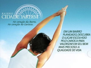 O documento descreve o empreendimento Cidade Jardim, localizado na Barra da Tijuca, Rio de Janeiro. O projeto inclui um parque de 100 mil m2 com diversas áreas de lazer ao ar livre, além de três edifícios residenciais com opções de plantas de 2, 3 e 4 quartos entre 74 e 115m2.