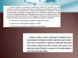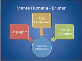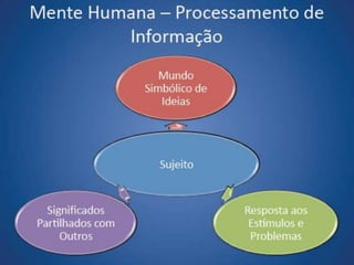 O documento discute o regresso do conceito de mente na psicologia devido aos limites do comportamentalismo. Comparou a mente a um computador, mas criticou este modelo por ser inadequado. Jerome Bruner criticou o comportamentalismo por se focar apenas no comportamento e não na mente. A mente é criativa, produz sentido e é pessoal, diferente de um computador. Os significados pessoais refletem o sujeito e os significados socioculturais refletem o grupo social.