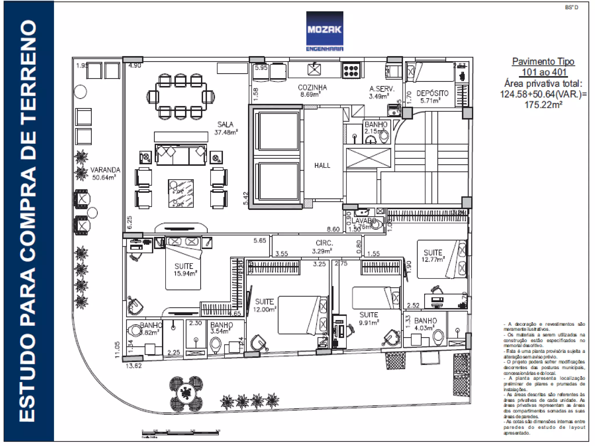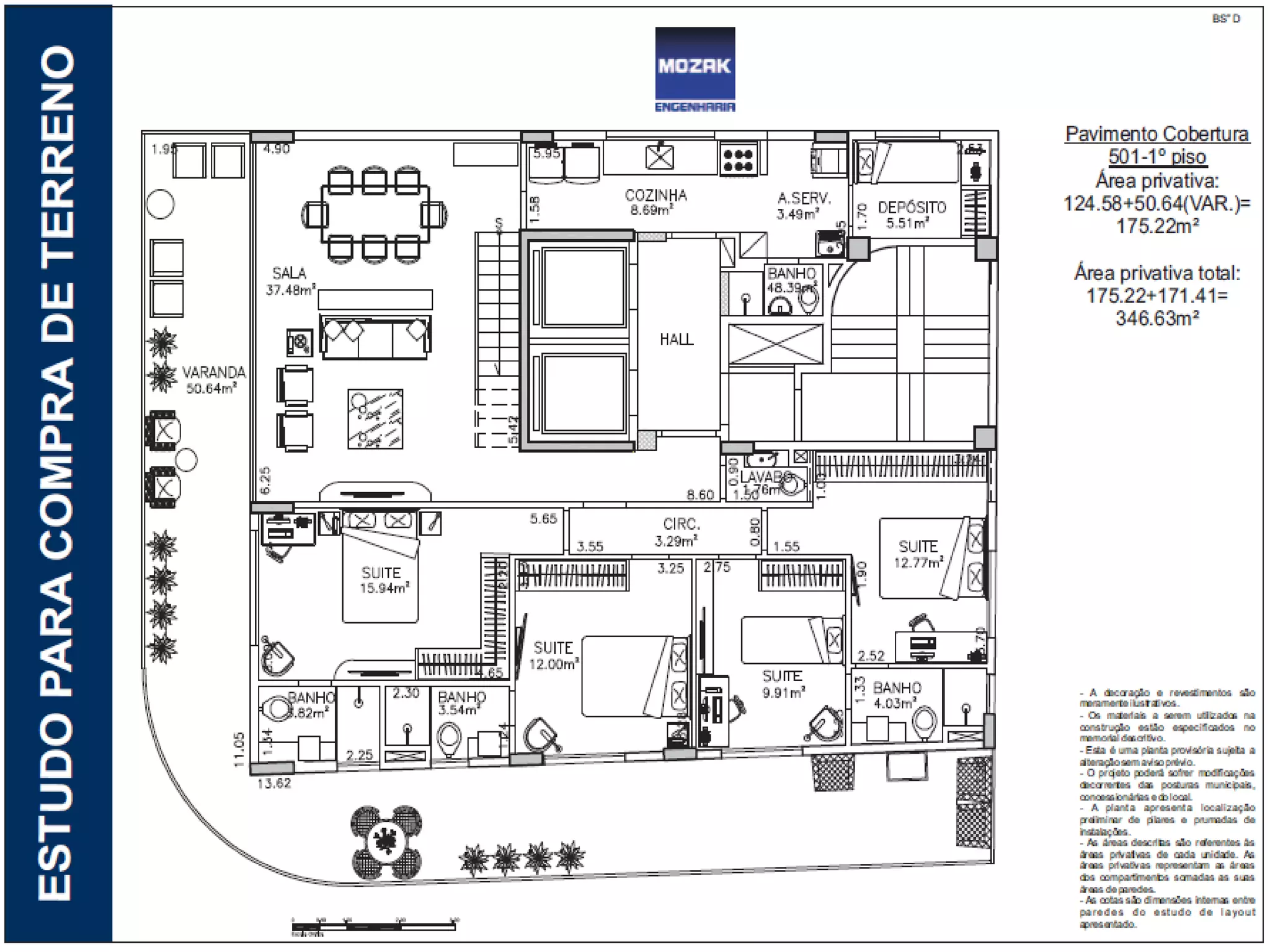 O documento apresenta detalhes da planta do pavimento térreo da PUC, com metragem total de 175,22 m² e área útil de 124,58 m². Inclui informações sobre a cobertura e varandas, além da duração da obra prevista de 34 meses. Contém também contatos da central de vendas para consultas.