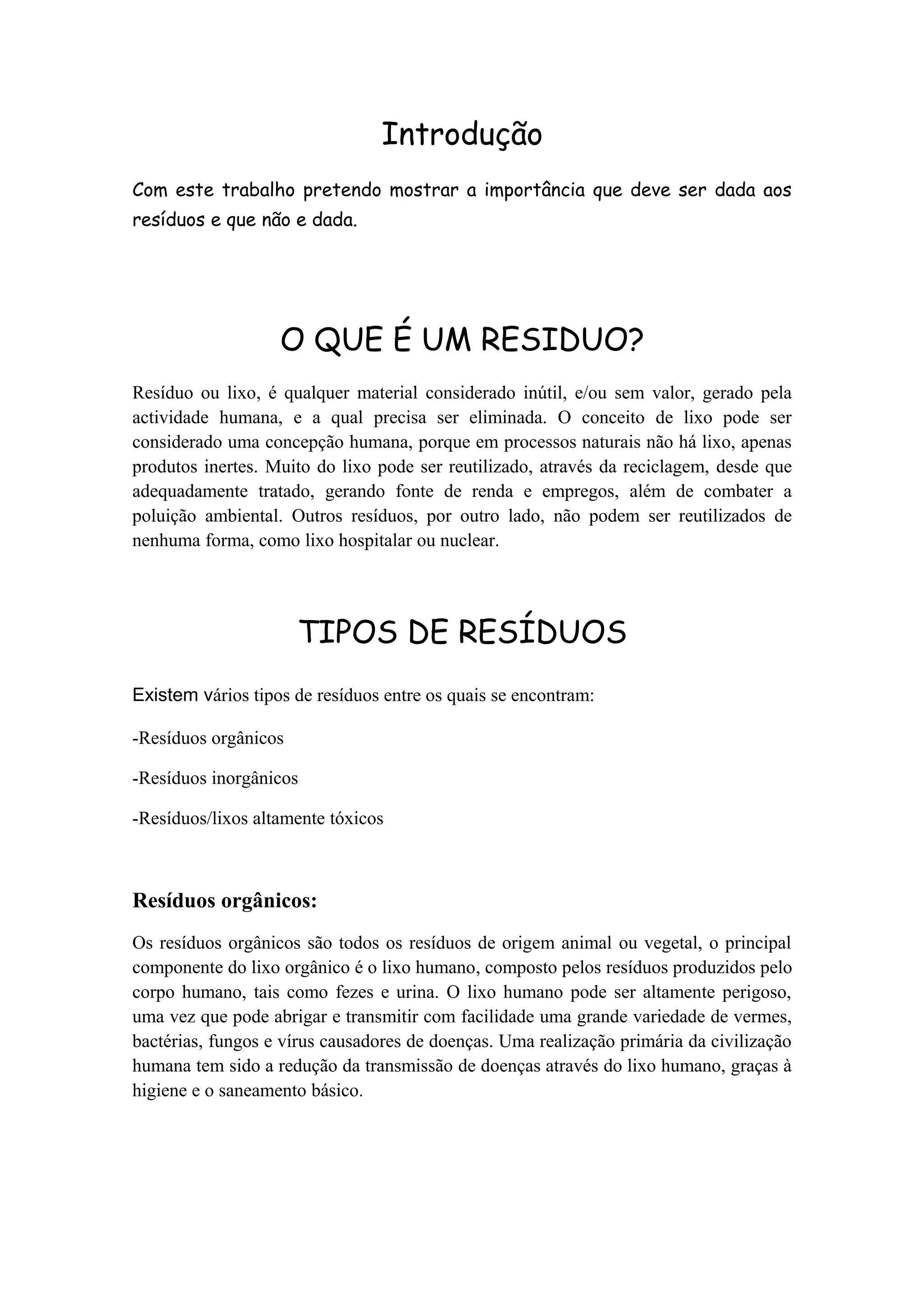 O documento discute a importância dos resíduos gerados pela atividade humana, classificando-os em diversos tipos, como orgânicos, inorgânicos e altamente tóxicos. Também aborda os métodos de tratamento dos resíduos, destacando a reciclagem como a forma mais benéfica para o meio ambiente, embora muitos materiais ainda não possam ser reciclados de forma viável. Além disso, enfatiza a necessidade de cuidados especiais no manejo de resíduos perigosos, como hospitalares e nucleares.