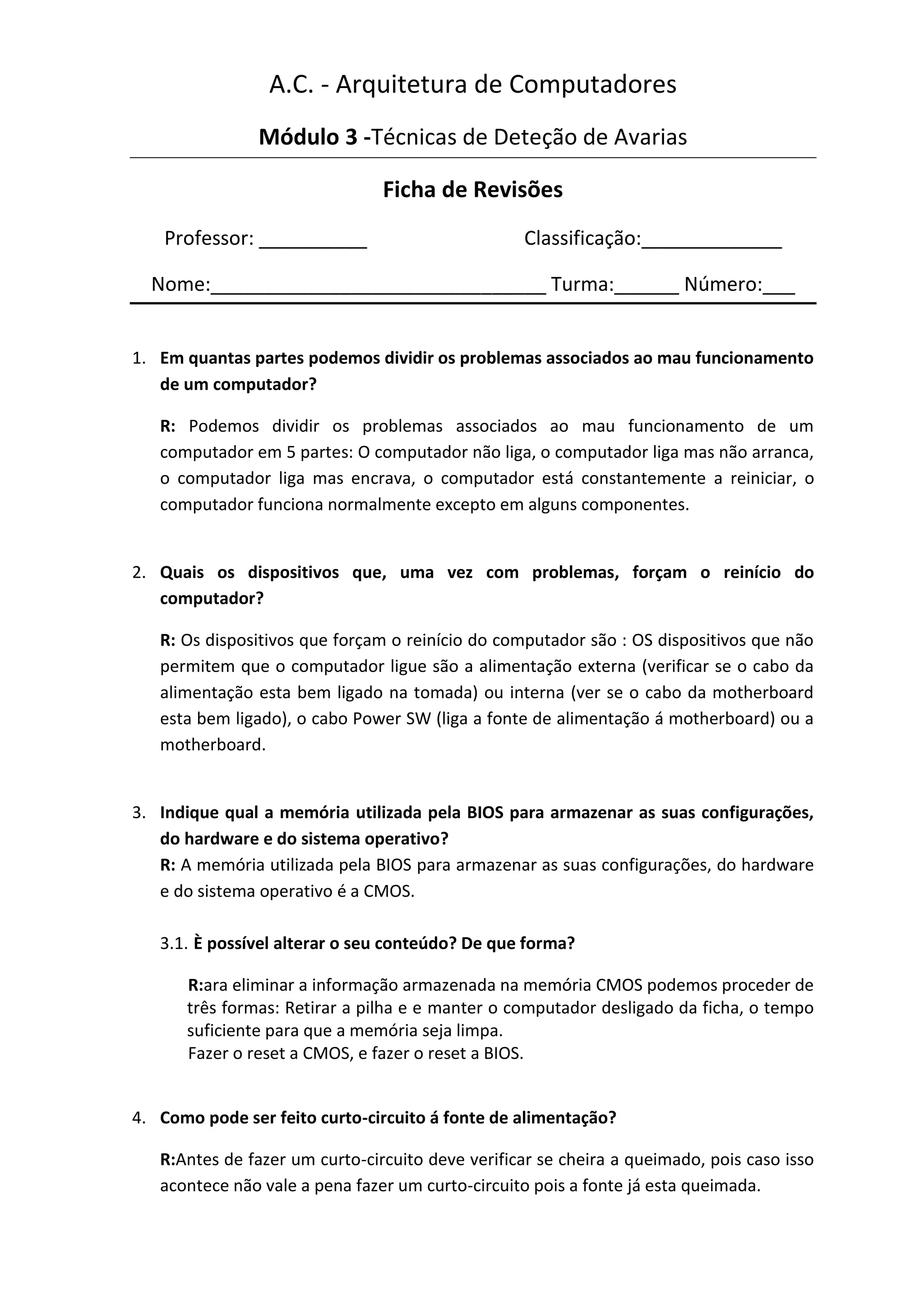 Este documento discute técnicas de detecção de falhas em computadores. Ele divide os problemas em 5 partes e discute causas comuns como problemas de alimentação, memória BIOS, placas gráficas e condensadores danificados. Ele também fornece instruções sobre como acessar a BIOS quando a senha é esquecida.