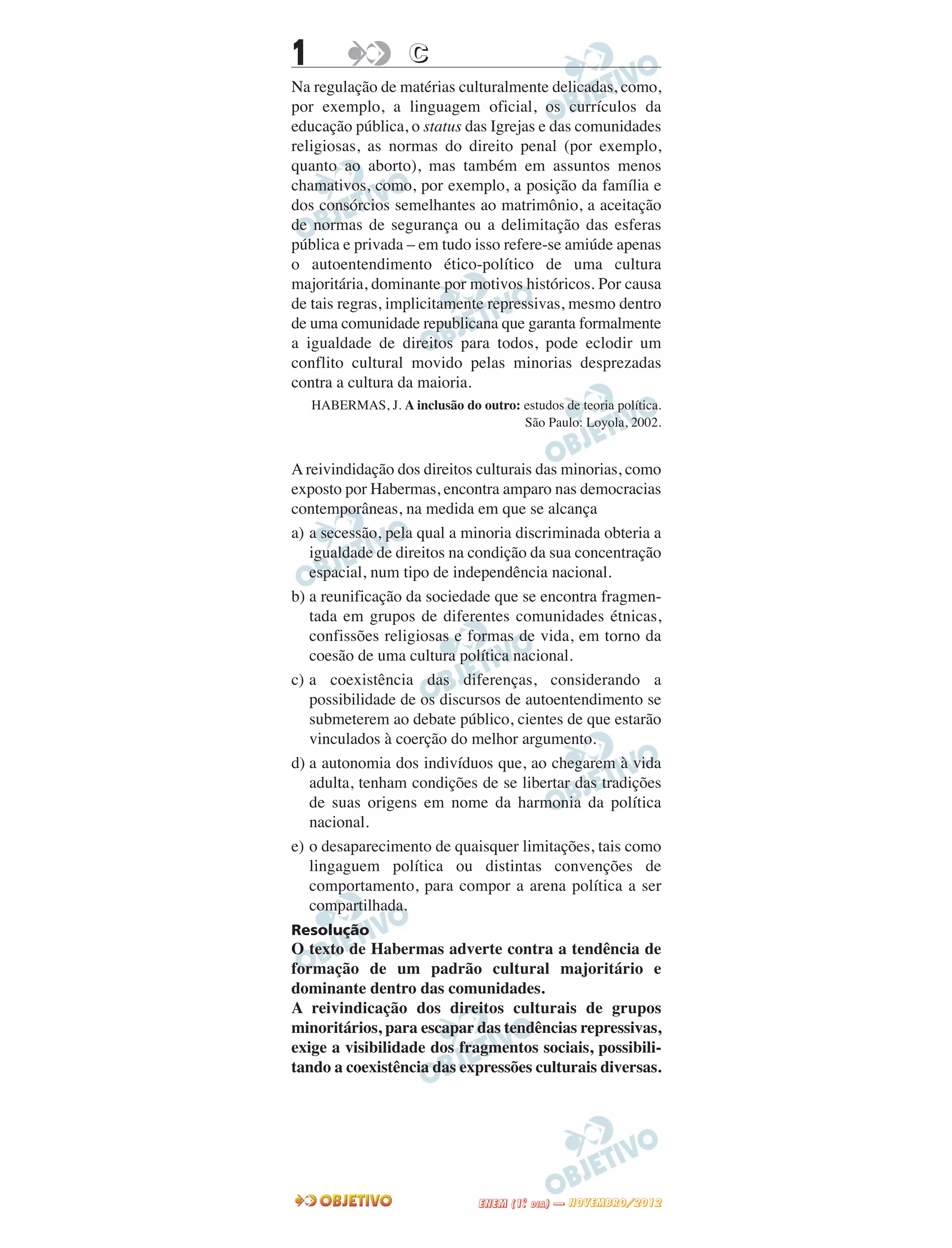 O documento discute a tendência de formação de uma cultura majoritária dominante dentro das comunidades, mesmo em sociedades que garantem formalmente igualdade de direitos. Isso pode levar ao conflito cultural entre minorias desprezadas e a cultura da maioria. A reivindicação dos direitos culturais de grupos minoritários exige visibilidade dos diferentes grupos sociais e a coexistência de expressões culturais diversas.