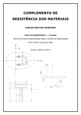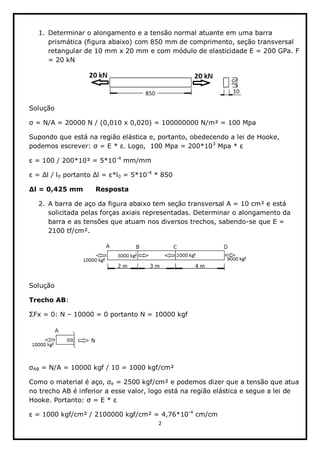 Este documento fornece exemplos de exercícios sobre resistência dos materiais, incluindo cálculos de tensões, alongamentos e determinação de áreas de seção transversal de barras sob cargas axiais. Resolve exemplos como determinar tensões em diferentes trechos de uma barra sob múltiplas forças, calcular alongamentos em barras elásticas e dimensionar perfis estruturais.