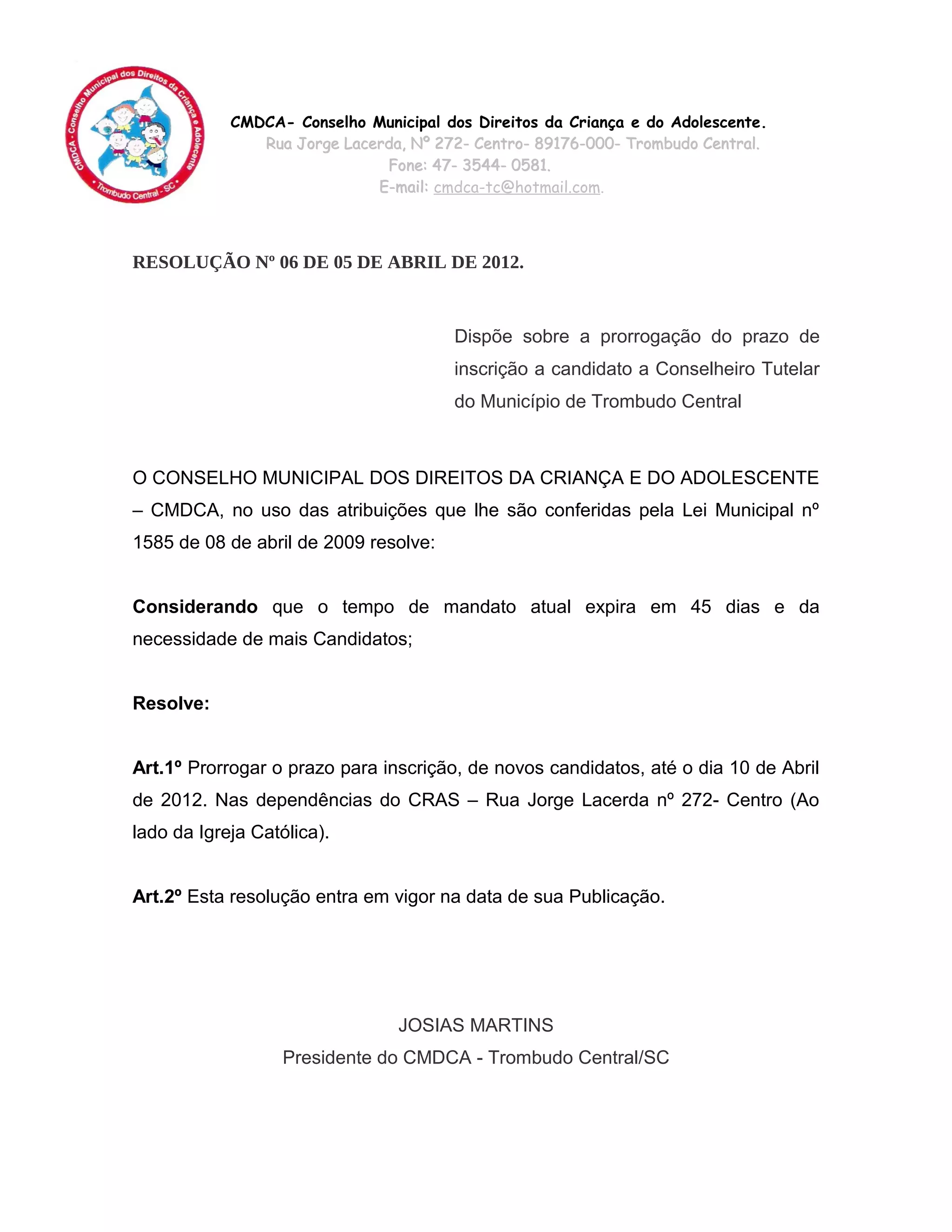 O Conselho Municipal dos Direitos da Criança e do Adolescente de Trombudo Central, Santa Catarina prorrogou o prazo para inscrição de novos candidatos a Conselheiro Tutelar até 10 de abril de 2012 devido ao mandato atual expirar em 45 dias e necessidade de mais candidatos.