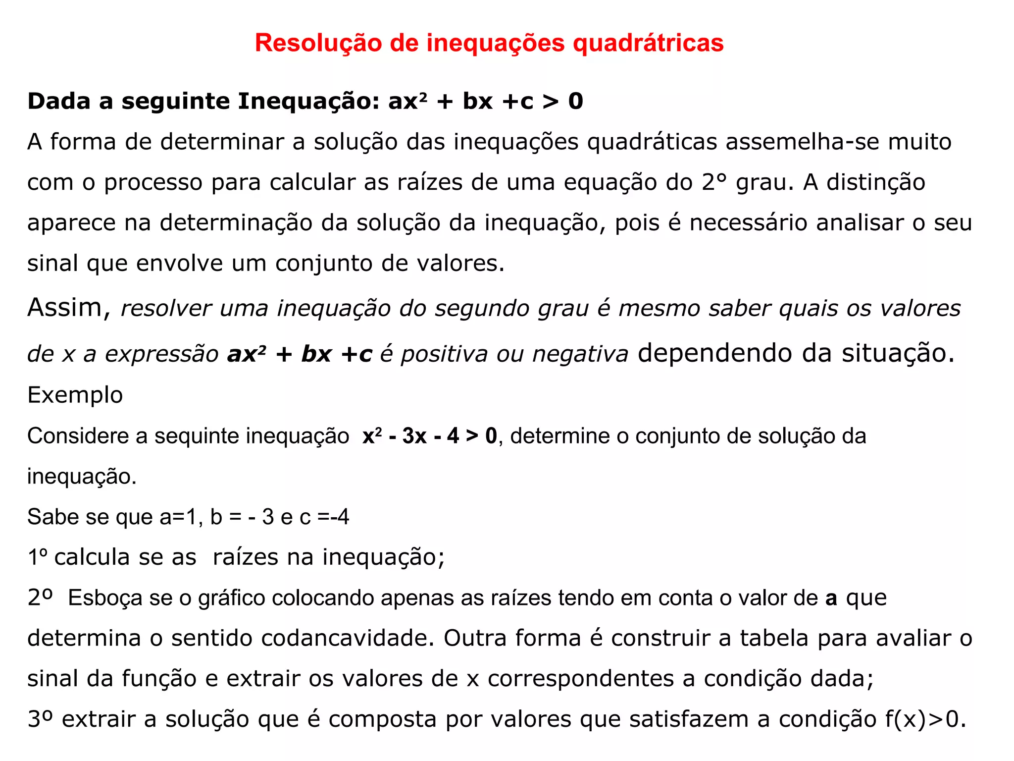 1) Resolução de inequações quadráticas envolve determinar as raízes da equação e analisar o sinal da função entre as raízes para identificar valores que satisfaçam a condição da inequação. 2) Um exemplo mostra como calcular as raízes, esboçar o gráfico da função indicando os valores positivos, e concluir que a solução é o intervalo entre as raízes. 3) A solução é determinada avaliando o sinal da função usando uma tabela ou gráfico para identificar valores que satisfaçam a condi