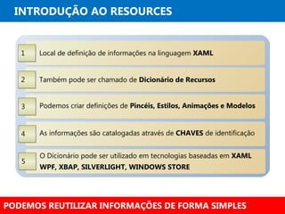 O documento descreve como usar recursos no XAML para reutilizar definições de estilos, pincéis e outros elementos. Os recursos podem ser definidos em dicionários de recursos e referenciados através de chaves estáticas ou dinâmicas. Isso permite aplicar estilos e propriedades de forma consistente em toda a aplicação.