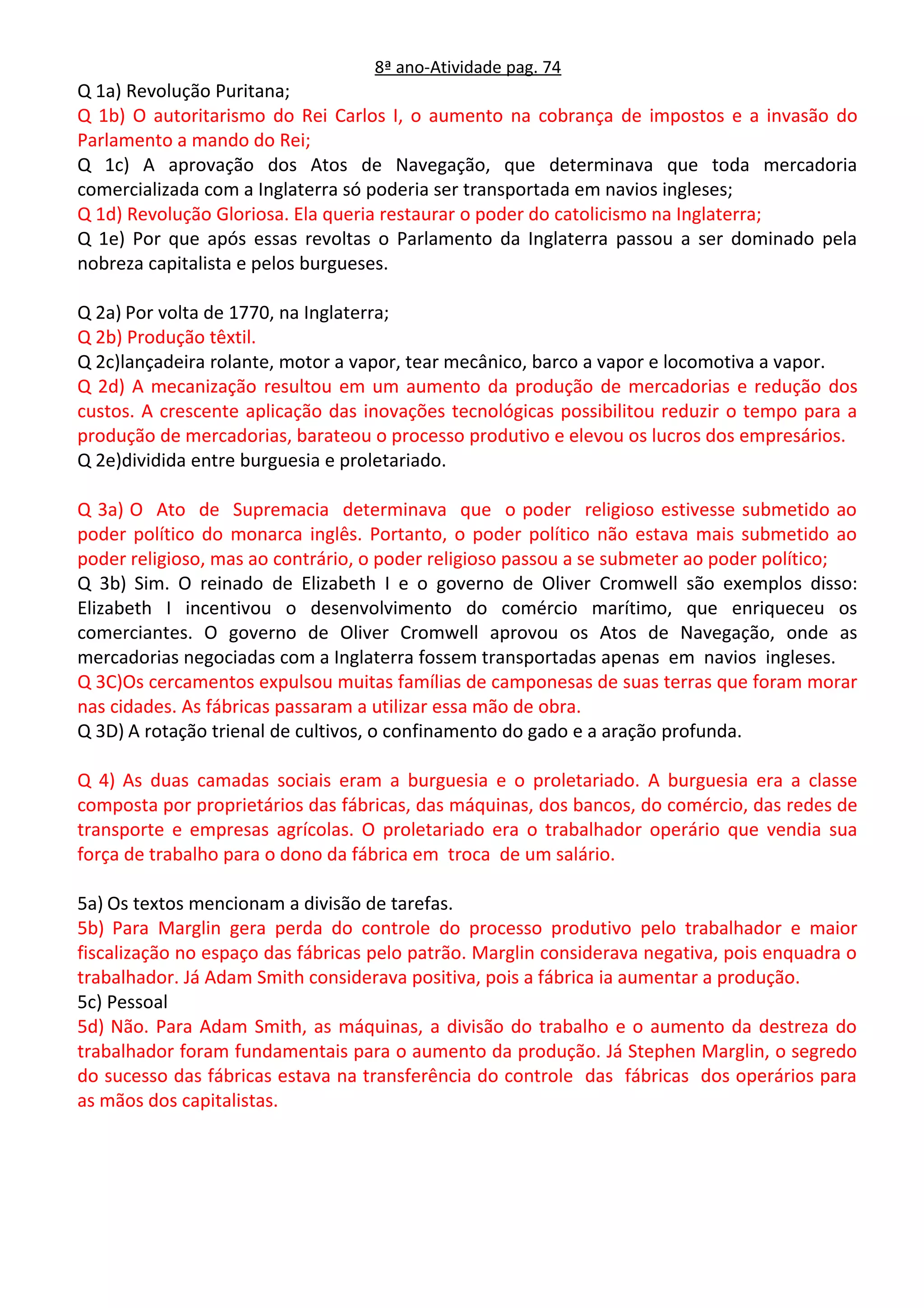 O documento resume questões sobre revoluções na Inglaterra, a Revolução Industrial e a divisão da sociedade em classes. A Revolução Puritana ocorreu devido ao autoritarismo do Rei Carlos I e aumento de impostos. A Revolução Gloriosa restaurou o poder do Parlamento sobre o monarca. A Revolução Industrial começou na Inglaterra na década de 1770, mecanizando a produção têxtil e dividindo a sociedade em burguesia e proletariado.