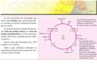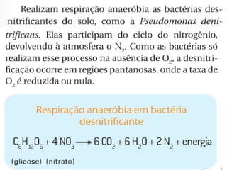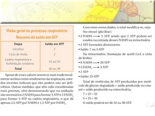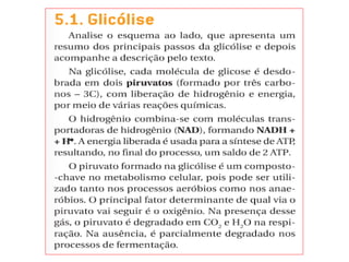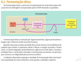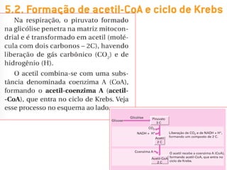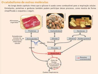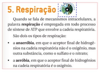 O documento discute a respiração celular, o processo pelo qual as células produzem energia a partir de nutrientes como a glicose na presença de oxigênio. A respiração celular ocorre principalmente nas mitocôndrias e envolve a glicólise, o ciclo de Krebs e a cadeia respiratória para produzir entre 36 e 38 moléculas de ATP. O documento também descreve os processos de fermentação lática e respiração aeróbica.