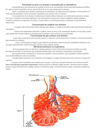 O documento discute o processo de respiração, incluindo a troca de gases nos pulmões e tecidos. Explica que a energia para o funcionamento das células vem de reações químicas que ocorrem durante a respiração celular, e que a quantidade de oxigênio e glicose usada nessas reações depende da energia necessária pelo corpo. Também descreve os movimentos respiratórios dos pulmões e músculos durante a inspiração e expiração.