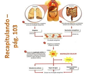 1) A respiração celular ocorre quando o sangue transporta nutrientes e oxigênio para as células, onde sofrem transformações que produzem energia, dióxido de carbono, vapor d'água e calor. 2) As necessidades energéticas dependem de fatores como idade, sexo, peso, atividade física e clima. Uma atividade física intensa implica em maior gasto de energia. 3) Se a quantidade de alimentos ingeridos for superior às necessidades energéticas, as pessoas ficam obesas;
