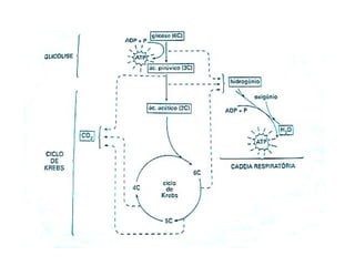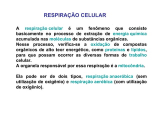 A respiração celular é o processo de extração de energia química de moléculas orgânicas através da oxidação de compostos como proteínas e lipídios. Isso ocorre principalmente na mitocôndria através da glicólise, ciclo de Krebs e cadeia respiratória, resultando na formação de ATP. A respiração aeróbica usa oxigênio e envolve essas três etapas, enquanto a anaeróbica não usa oxigênio.