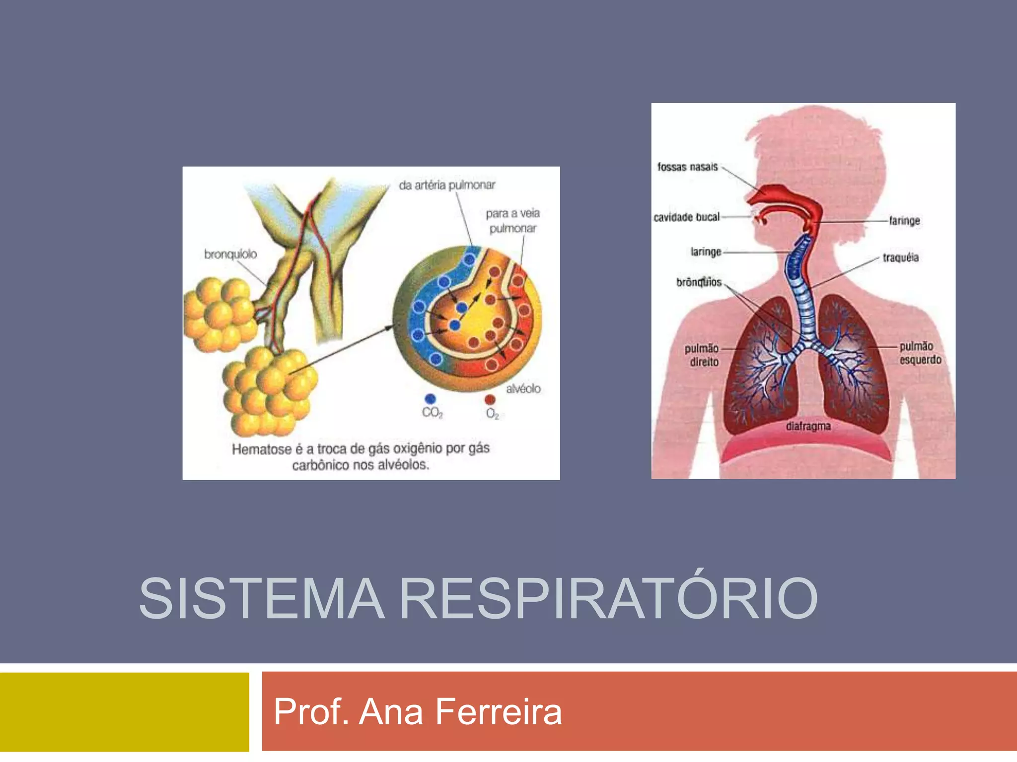1) O documento descreve as estruturas do sistema respiratório como as fossas nasais, faringe, laringe, traqueia, brônquios, bronquíolos e sacos alveolares; 2) Explica como ocorrem os processos de inspiração e expiração através da contração e relaxamento do diafragma e músculos intercostais; 3) Detalha os processos de trocas gasosas que ocorrem nos pulmões e nas células, conhecidos como hematose pulmonar e hematose celular.