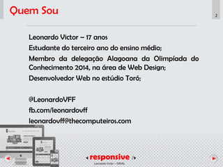Leonardo Victor é um estudante de 17 anos do terceiro ano do ensino médio e desenvolvedor web, que participou da Olimpíada do Conhecimento em 2014. O documento aborda o design responsivo, destacando a importância do planejamento e desenvolvimento para uma experiência de visualização otimizada em diferentes dispositivos. São discutidos aspectos como layout fluido, navegação e o uso de media queries para economizar tempo e recursos no desenvolvimento web.