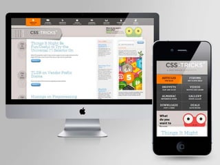 O documento discute o conceito de design responsivo e como criar sites adaptáveis para diferentes dispositivos. Ele explica que o design responsivo usa grids fluidos, layout adaptativo e conteúdo flexível para se ajustar a telas de diferentes tamanhos. Também fornece dicas sobre como criar estruturas fluidas usando fontes, grids e imagens relativas, além de explicar o uso de media queries e breakpoints para personalizar o design em diferentes resoluções.