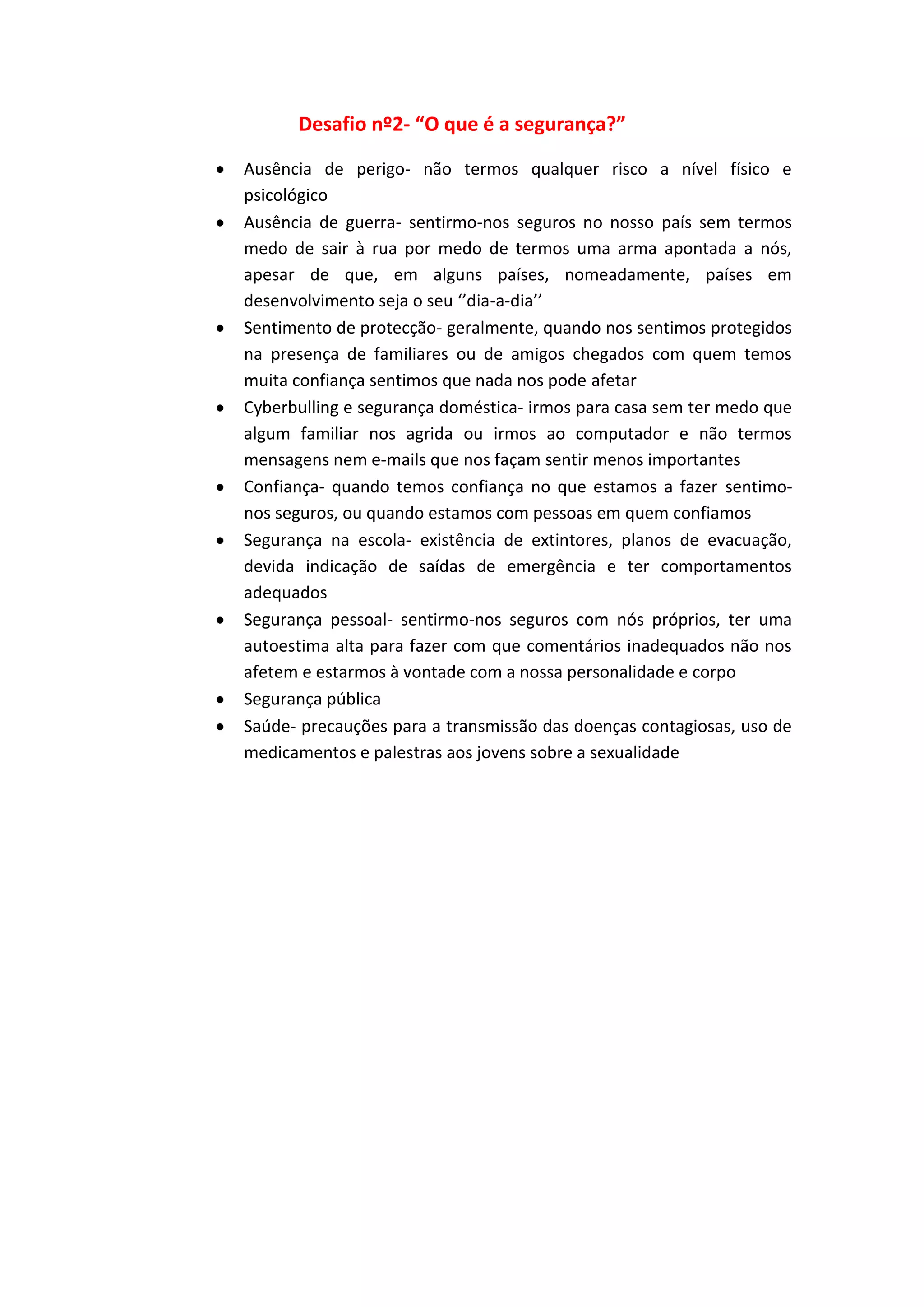 A segurança é definida como a ausência de perigo físico e psicológico, a ausência de guerra e o sentimento de proteção quando estamos com pessoas em quem confiamos. Outros aspectos importantes incluem se sentir seguro em casa e na escola, ter confiança em si mesmo e nos outros, e ter saúde e segurança públicas.