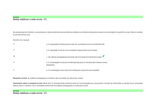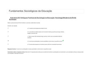 1) O documento discute os enfoques teóricos da sociologia na educação de Émile Durkheim e Max Weber.