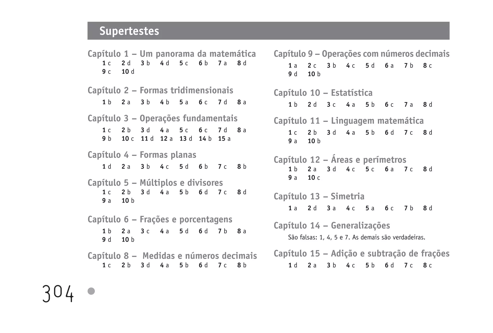 O documento apresenta os capítulos de um livro didático de matemática, com as respostas corretas para exercícios de cada capítulo. Os capítulos vão de operações básicas a estatística, geometria e álgebra.