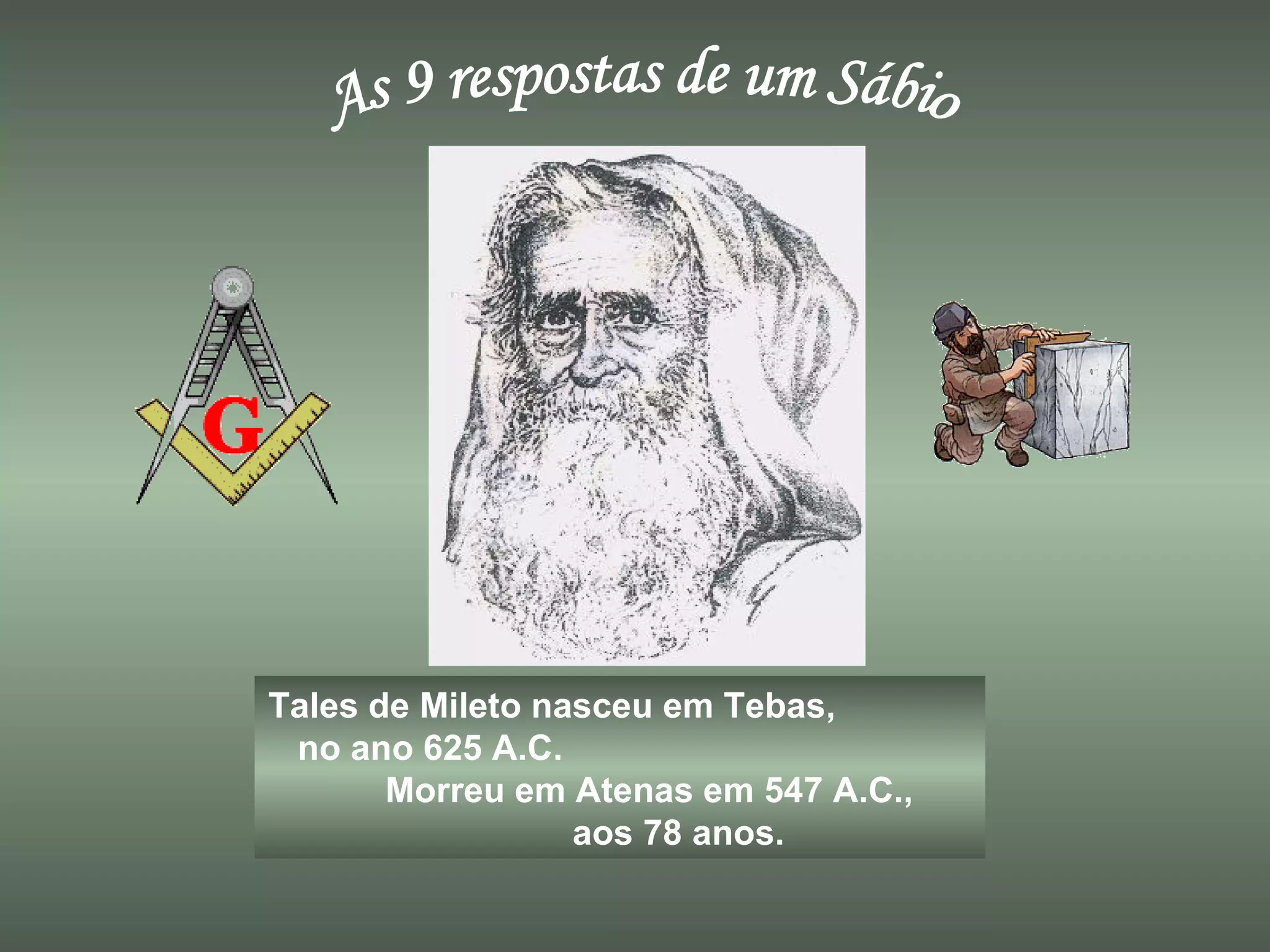 Tales de Mileto foi um filósofo grego do século VI a.C. considerado um dos Sete Sábios da Grécia. Ele realizou estudos matemáticos e astronômicos no Egito e previu eclipses com precisão. Quando questionado por um sofista, respondeu sábiamente nove perguntas sobre temas como Deus, o universo e a virtude, afirmando ser mais difícil o autoconhecimento.