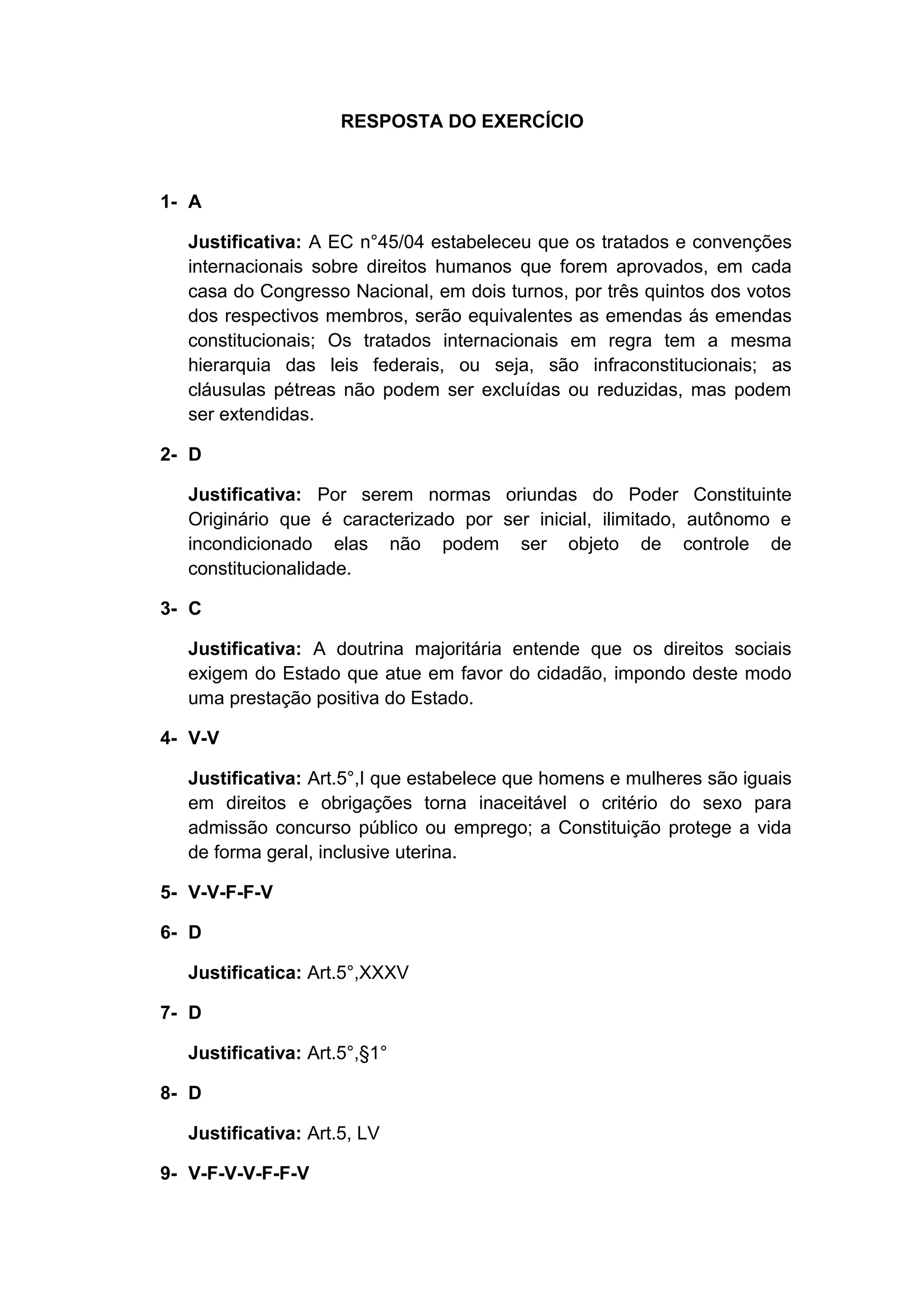 O documento fornece respostas e justificativas para 63 questões sobre direitos e garantias fundamentais previstos na Constituição Federal brasileira. As respostas abordam temas como hierarquia das normas constitucionais, controle de constitucionalidade, direitos sociais, igualdade, direito à vida, liberdade de expressão, sigilo profissional, nacionalidade, domicílio eleitoral, entre outros.