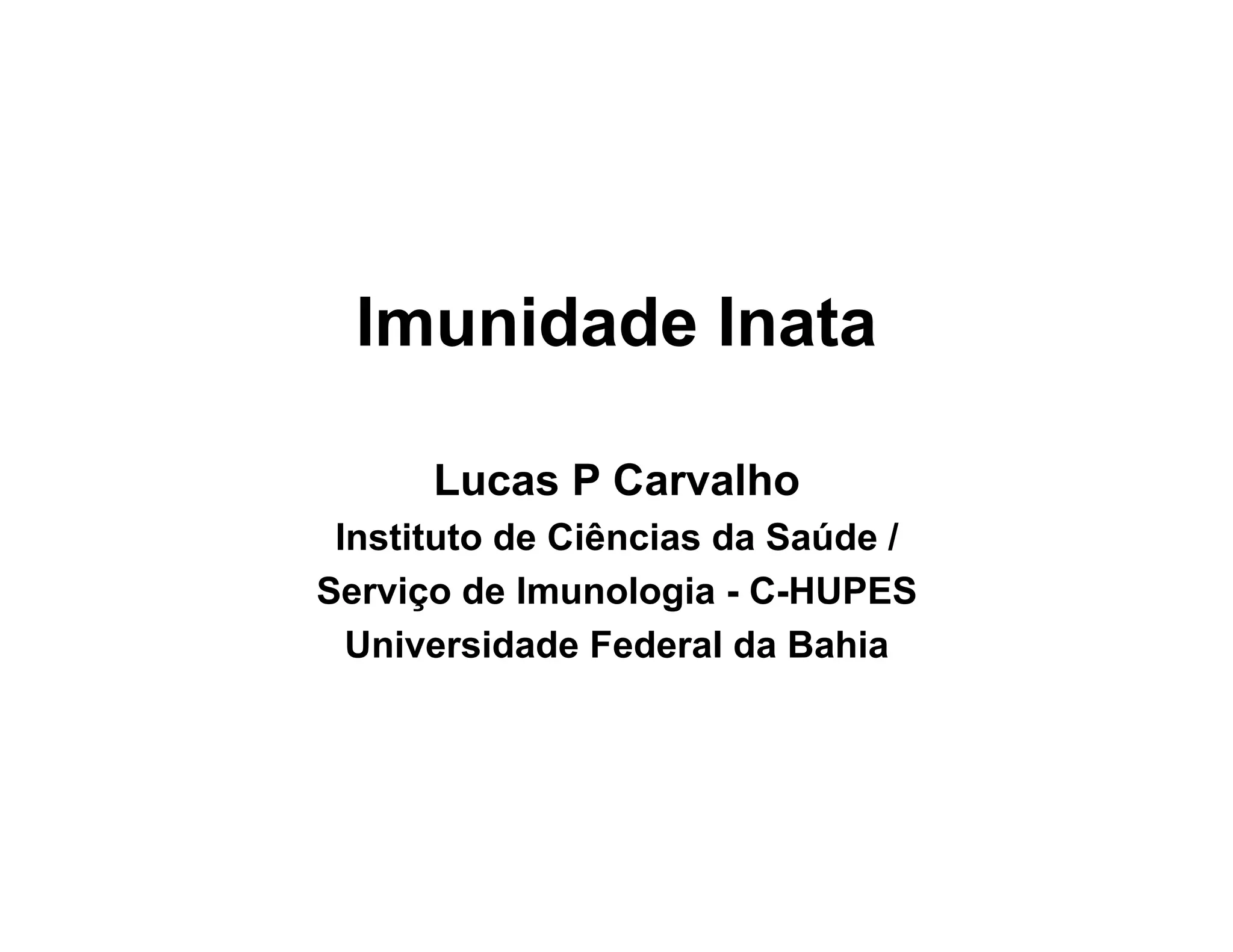 O documento discute os principais componentes e mecanismos da imunidade inata, incluindo células como macrófagos, neutrófilos e células NK; proteínas como o complemento; e receptores de reconhecimento de padrão como os receptores Toll-like. A imunidade inata é responsável pela primeira linha de defesa contra patógenos e ativa a resposta imune adaptativa.