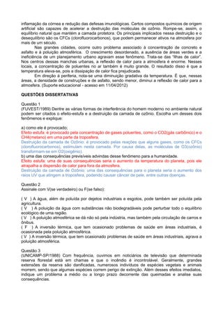 O documento discute diversos aspectos da poluição do ar, incluindo suas principais causas (atividades industriais, veículos, queimadas), fenômenos como a inversão térmica que agravam os efeitos da poluição, e consequências como chuvas ácidas, efeito estufa e destruição da camada de ozônio.