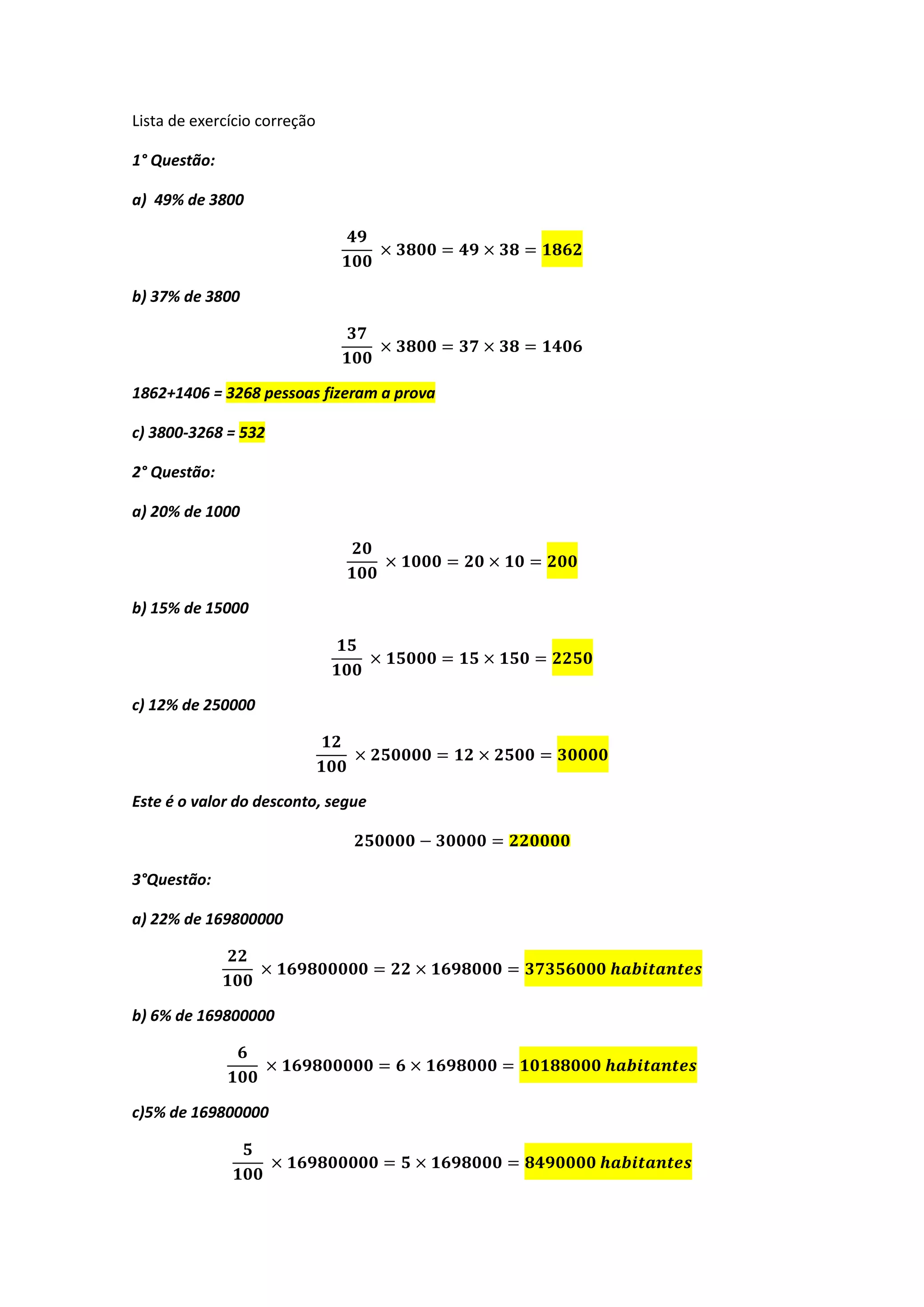 A lista de exercícios contém 4 questões sobre porcentagem e descontos. A primeira questão calcula 49% e 37% de 3800 pessoas e subtrai o total da prova do total de pessoas. A segunda questão calcula porcentagens de 1000, 15000 e 250000. A terceira questão calcula diferentes porcentagens aplicados a R$16.980.000,00. A quarta questão não fornece opções.