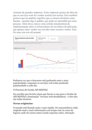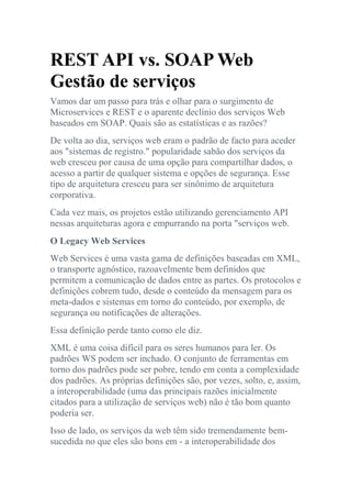 O documento discute as vantagens das APIs REST em relação aos serviços web SOAP. As APIs REST são mais simples, facilitam o desenvolvimento ágil e permitem que as empresas respondam mais rapidamente às demandas dos clientes em um mundo cada vez mais digital e móvel. Embora os serviços web tenham sido populares no passado, as APIs REST são melhor adaptadas aos padrões de desenvolvimento atuais.
