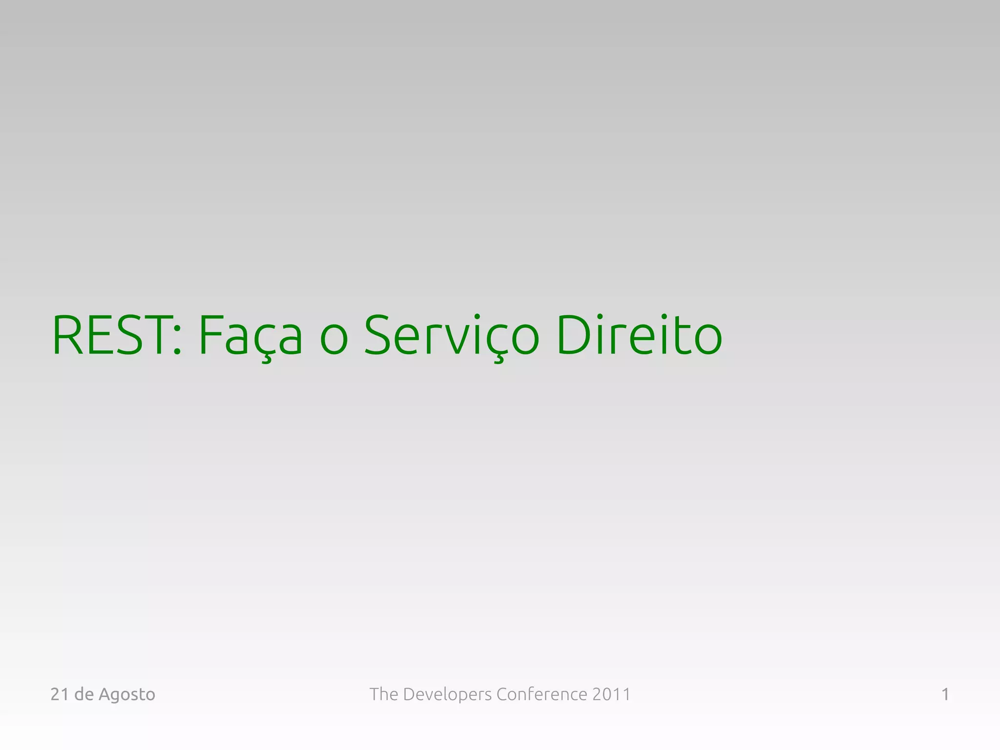 O documento apresenta o conceito do REST e seu papel no projeto de sistemas RESTful. Ele discute a identificação de recursos através de URIs, os verbos e substantivos associados, além de ferramentas para implementação. Exemplos práticos são fornecidos, incluindo um portal de informações sobre cervejas chamado 'restbeer'.