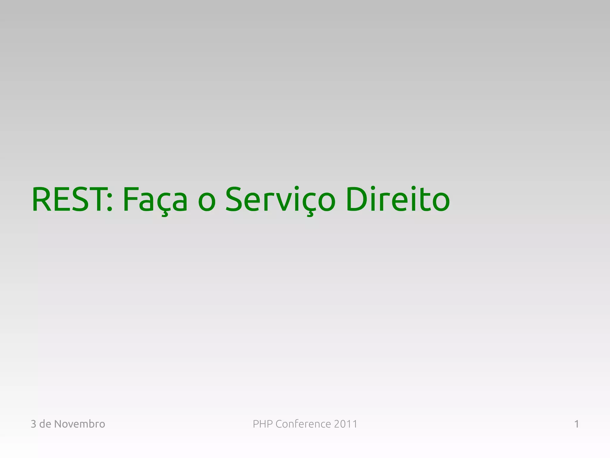 O documento apresenta os princípios arquiteturais do REST através de 6 regras: cliente-servidor, sem estado, cache, interface uniforme, camadas e código sob demanda. O palestrante explica cada regra e como aplicá-las em um projeto imaginário para melhorar a portabilidade, escalabilidade e simplicidade do sistema.