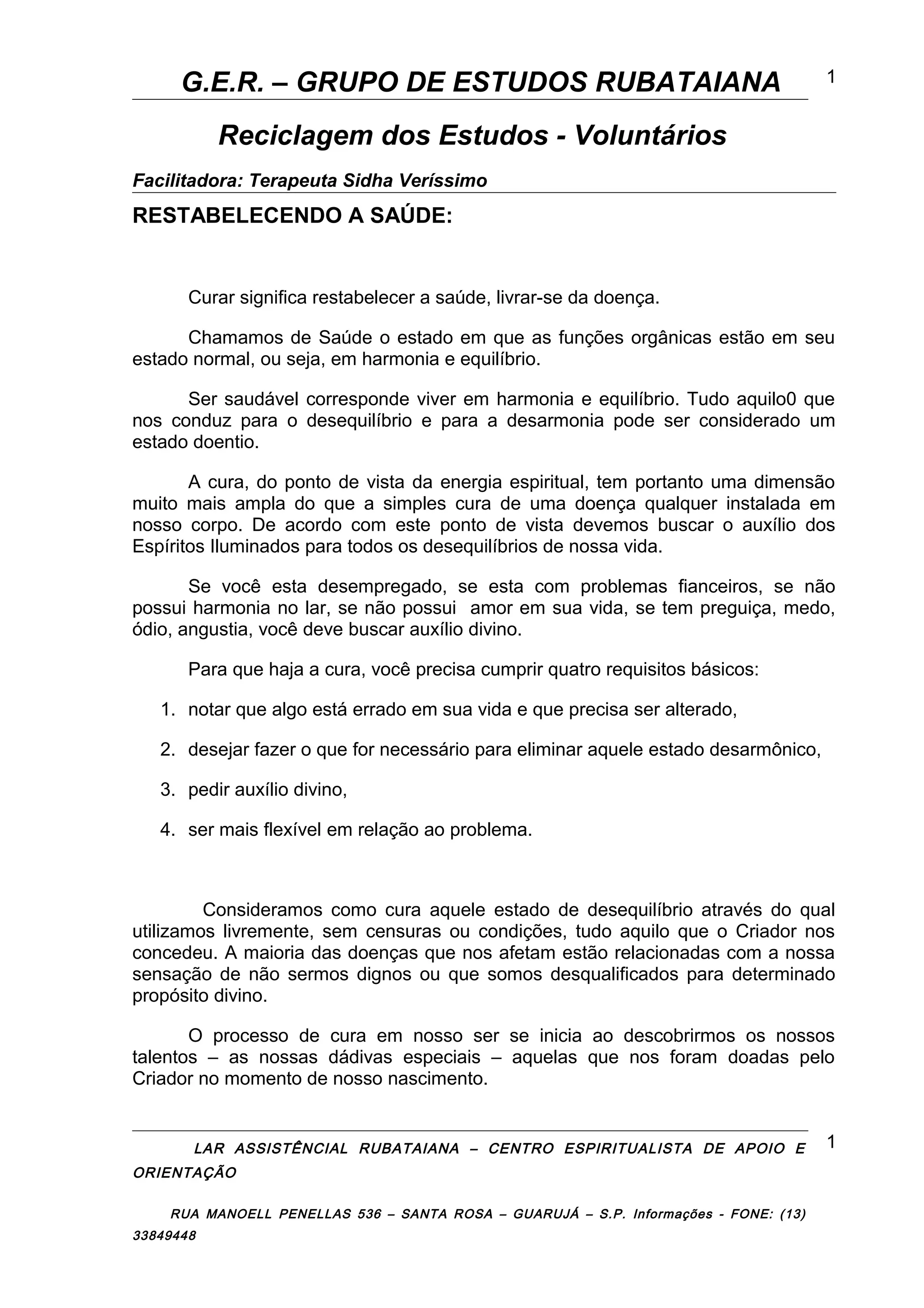 O documento discute a cura como um processo de restabelecer o equilíbrio e harmonia no corpo, coração e mente. A cura espiritual envolve pedir ajuda divina para problemas como desemprego, finanças, relacionamentos e emoções negativas. Para haver cura, é necessário reconhecer que algo está errado, desejar corrigi-lo, pedir ajuda e ser flexível.