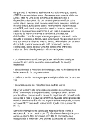 O documento discute alguns problemas com o uso de códigos de status HTTP para sinalizar erros de negócios em APIs RESTful. Também levanta preocupações sobre a dependência temporal causada pelo padrão de solicitação-resposta e a falta de padrões claros para implementar APIs RESTful.