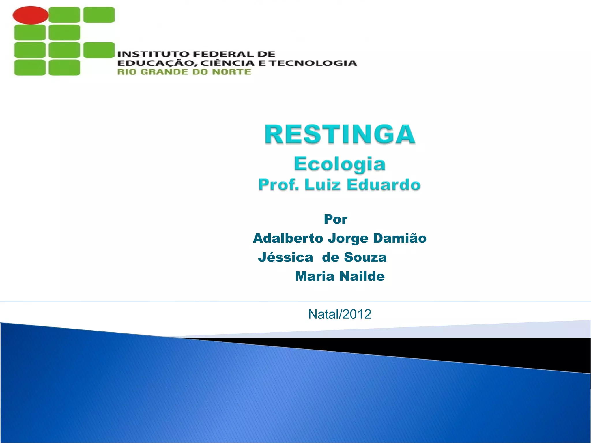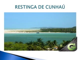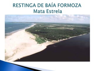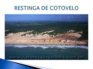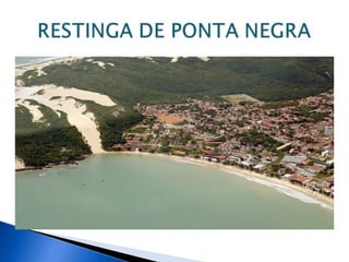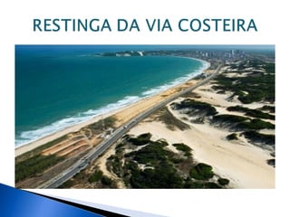 O documento descreve a restinga do Rio Grande do Norte, abordando sua localização, clima, solo, relevo, vegetação e áreas de preservação, como a RPPN Mata Estrela, RDS Ponta do Tubarão e o Parque das Dunas. Conclui que a restinga enfrenta processo de abandono e grande risco de extinção devido à falta de políticas de conservação e ao desenvolvimento urbano.