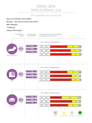 Este documento fornece estatísticas sobre o desempenho de alunos em uma escola em língua portuguesa, incluindo: 1) 69% dos alunos estão no nível baixo e 23% no nível intermediário; 2) A média da escola foi de 234,9 contra 227,5 da rede; 3) As taxas de desempenho melhoraram levemente de 2012-2014.