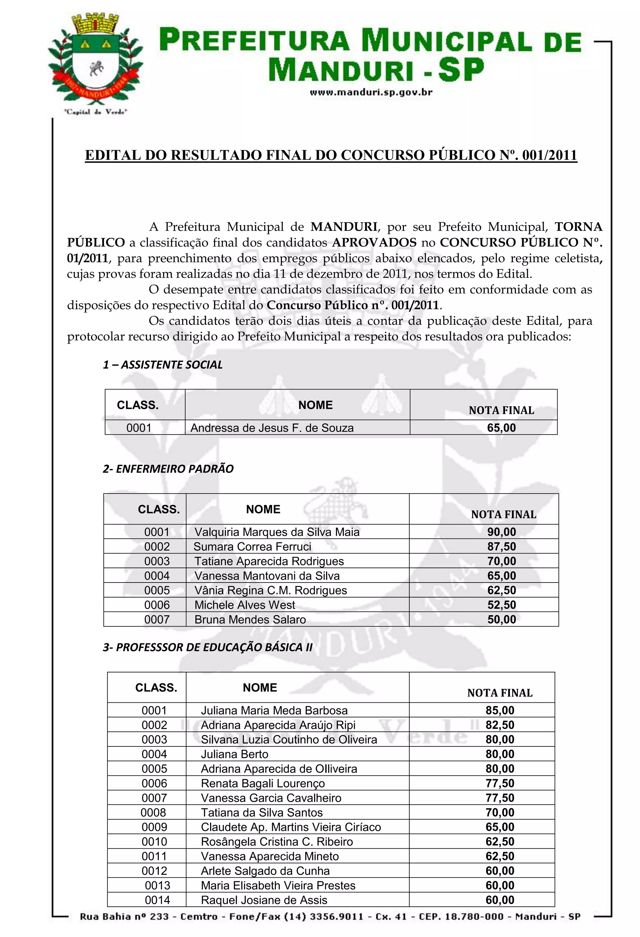 O documento publica os resultados finais do concurso público no 001/2011 da Prefeitura Municipal de Manduri, listando os candidatos aprovados para as vagas de Assistente Social, Enfermeiro, Professor de Educação Básica II, Agente de Vigilância do Setor de Saúde, Tratorista e Auxiliar de Serviços Gerais, com seus respectivos nomes e notas finais. Os candidatos terão dois dias para entrar com recurso.