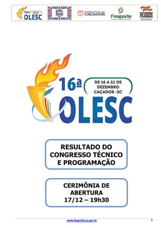 O documento apresenta a programação e resultados dos congressos técnicos e competições dos Jogos Escolares de Santa Catarina, abrangendo várias modalidades como atletismo, ciclismo e ginástica artística. As datas dos eventos vão de 12 a 21 de dezembro, com locais de competição específicos para cada modalidade e horários detalhados. O texto inclui informações sobre participantes, locais dos congressos e detalhes logísticos para as competições.