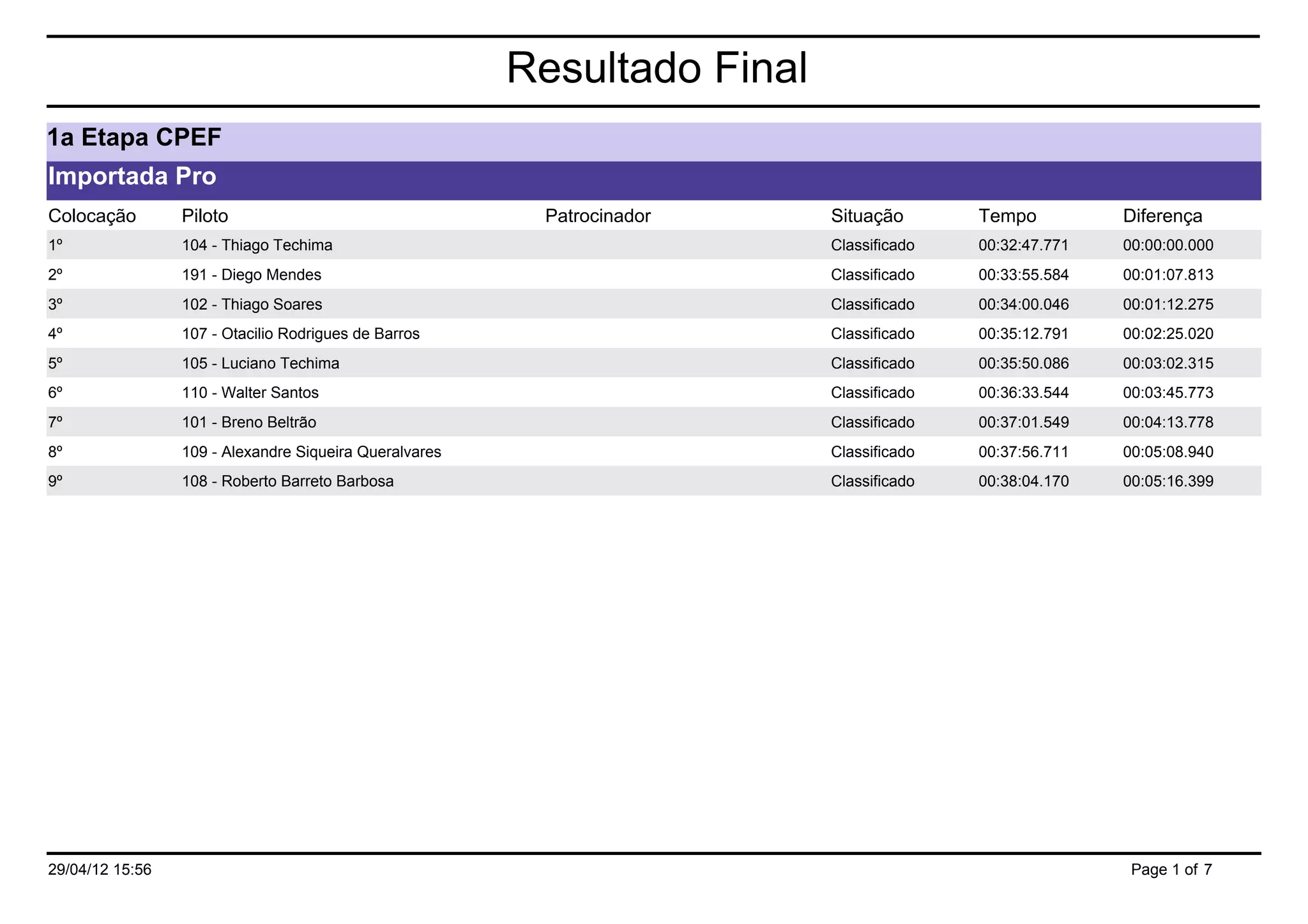 O documento apresenta os resultados da 1a etapa do Campeonato Paulista de Enduro de Formação com as classificações de várias categorias como Pro, Iniciante, Over 35 Nacional, Força Livre Nacional e Quadriciclo até 420. O piloto Thiago Techima ficou em 1o lugar na categoria Pro e José Michelon ficou em 1o na 230 Pro. Na 230 Iniciante, Renato Rodrigues da Silva ficou em 1o.
