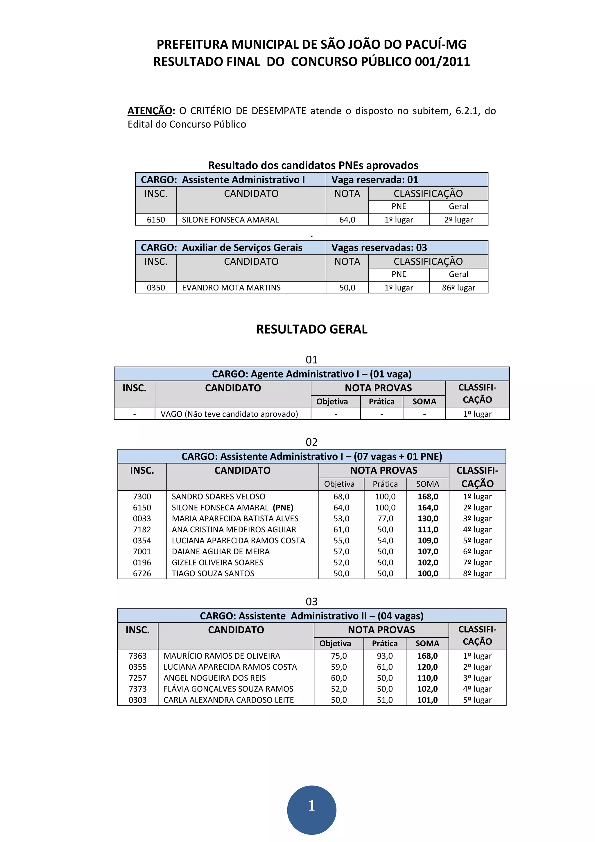 O documento apresenta os resultados finais de um concurso público municipal para diversos cargos, incluindo Assistente Administrativo, Auxiliar de Serviços Gerais e Assistente Social. É listado o nome e nota de cada candidato aprovado, assim como sua classificação geral e, quando aplicável, classificação para vagas reservadas a pessoas com deficiência.