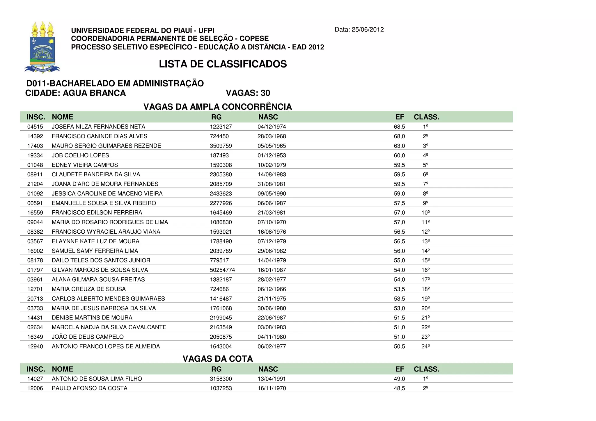O documento apresenta três listas de classificados para cursos de graduação da Universidade Federal do Piauí em Agua Branca, com os nomes dos aprovados, número de inscrição, RG, data de nascimento, nota e classificação. As listas incluem vagas da ampla concorrência e da cota.