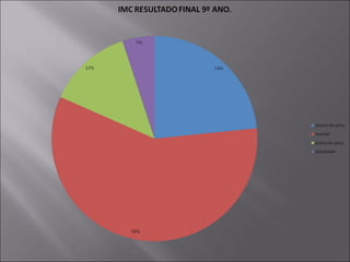 O documento discute índices de peso e obesidade entre jovens brasileiros. Ele apresenta dados do Ministério da Saúde e do IBGE mostrando que 48,1% dos brasileiros estão acima do peso e 15% são obesos. Os dados da Fundação Bradesco são mais positivos, com apenas 10% acima do peso e 4% obesos entre alunos do 8o e 9o ano. O documento atribui esses resultados mais favoráveis às políticas pedagógicas adotadas para promover saúde e qualidade de vida.